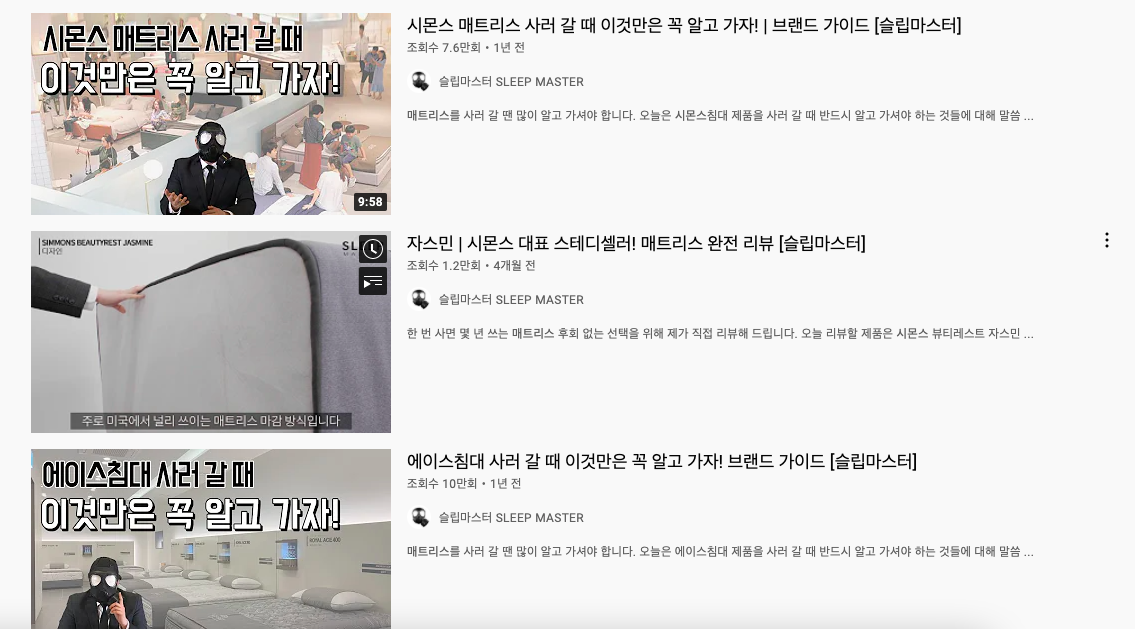 유튜브 / 현대백화점 판교점 / 시몬스 공식 홈페이지- 온라인/모바일 콘텐츠 (유튜브, 블로그 등) : 매트리스 구매 결심 후 유튜브나 블로그를 통해 다양한 매트리스를 후보로 올린다. 이 과정에서 시몬스 브랜드를 구매 고려군으로 선정하고, 무수한 브랜드 매트리스와 비교를 시작한다. / 현재 유튜브에는 '굳이 비싼 매트리스 사지 않아도 되는 이유' 와 같이 가성비 좋은 매트리스를 추천하는 위주로 콘텐츠가 인기를 끌어 시몬스에 좋지 않은 영향 - 시몬스 공식 홈페이지 : 제품 설명, 문의 혹은 직접 비교 체험해볼 수 있는 오프라인 매장을 확인하기 위해 공식 홈페이지를 방문한다 / 첫 화면 팝업으로 구매를 유도하는 프로모션 이벤트도 함께 확인한다. / 우측 상단에 뜨는 프로모션 정보로 구매를 촉진시킬 수 있음 - 오프라인 매장 (백화점, 직영점, 대리점): 구매 고려 대상 안에 들어간 브랜드의 오프라인 매장에 방문하여 직접 제품을 경험 / 소비자는 이때 경쟁사 제품들과 비교하며 방문한 매장 경험이 만족스럽지 않을 경우 이탈될 가능성 있음