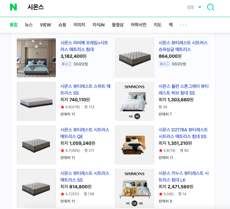 네이버 시몬스 검색 / SSG 시몬스 검색 / 네이버쇼핑 시몬스 검색- 온라인 / 모바일 APP : 합리적인 가격을 찾아 PC와 모바일 다방면으로 제품 검색하며 다양한 채널 방문 / 과한 정보들로 피로감을 제공할 수 있음 - 온라인 AD (SA, DA, 인스타그램, 유튜브 등) : 구매할 제품 결정 후, 다양한 채널 가격 검색 도중 접하게 되는 광고들/과한 정보들로 피로감을 제공할 수 있음